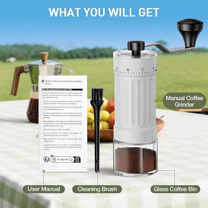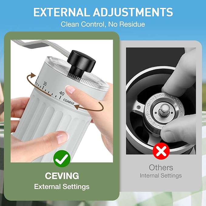 - 40 EXTERNAL ADJUSTABLE GRIND SETTINGS – Unlike traditional grinders with hidden internal adjustments, our manual coffee mill features 40 precise external settings for effortless fine-tuning. Simply turn the dial to switch from espresso-fine to French press-coarse—no guesswork, no messy spills. Enjoy full control over your grind for richer flavor in every cup!
