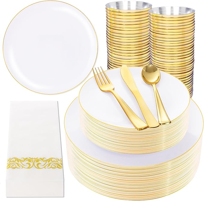 - SET FOR 50 GUESTS: NOCCUR disposable dinnerware set contain 50 dinner plates, 50 dessert plates, 150 gold plastic cutlery, 50 cups and 50 napkins. These white and gold plates are enough to hold a wonderful party for 50 guests