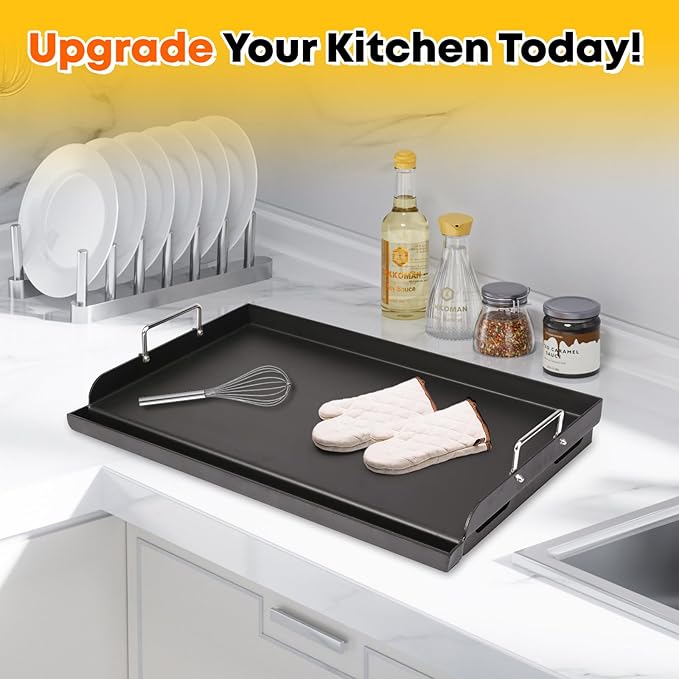 - 【Premium Construction】Heavy-duty carbon steel griddle with nanoceramic nonstick coating ensures durability,heat resistance,and warp-free performance.Reinforced edges prevent scratching while polished sidewalls contain grease spills.Maintains structural integrity even under high-temperature cooking