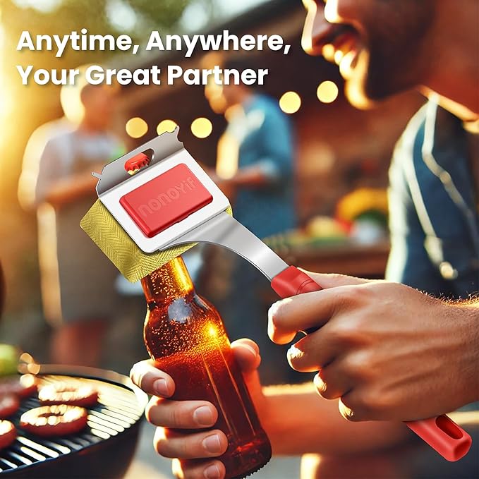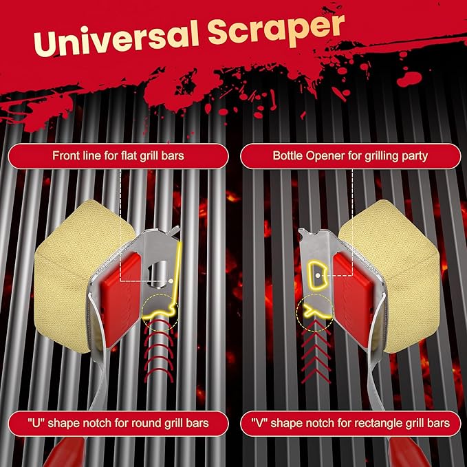 - 【Multi-Use Scraper】: 1. Left "V" shape notch is perfect for rectangle grill bars. 2. Right Round shape notch is perfect for round grill bars. 3. Front line is perfect for flat grill bars. 4. Middle hollow parts as a bottle opener is the best partner for grilling party.