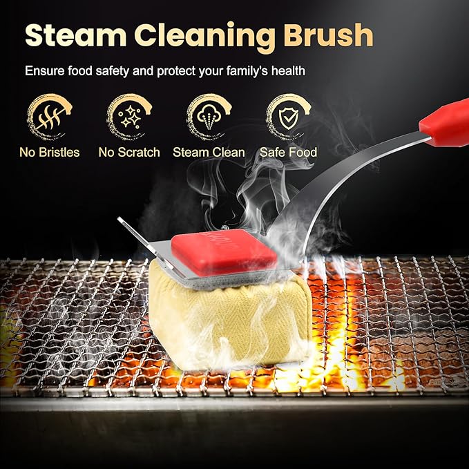 - 【Bristle Free Brush】: The bristle free grill brush uses innovative steam cleaning technology, effectively remove most residue. Unlike traditional bristle brush, our brush would not leave any bristle on food or any scratch on grate. Ensure food safety and protect your family's health.