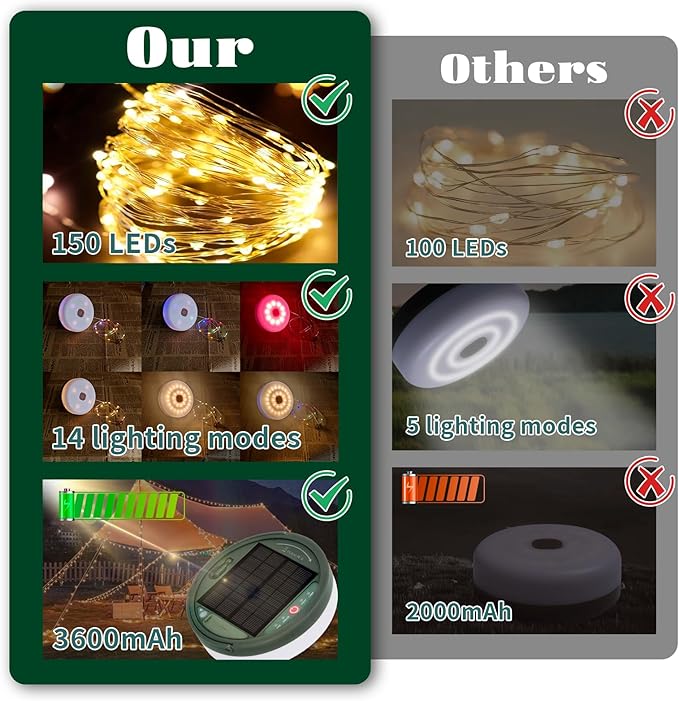 - 180 LEDs for Ultimate Illumination: Camping Lights With 150 dense fairy LEDs on a 32.8-foot string LED spacing is 1.9 inches and 30 brighter LEDs in the camping lamp , these solar camping lights provide a wide lighting area and a magical atmosphere. They are perfect camping essentials for lighting up your campsite, tent, RV, or trailer, and are equally ideal for parties and holiday decorations.