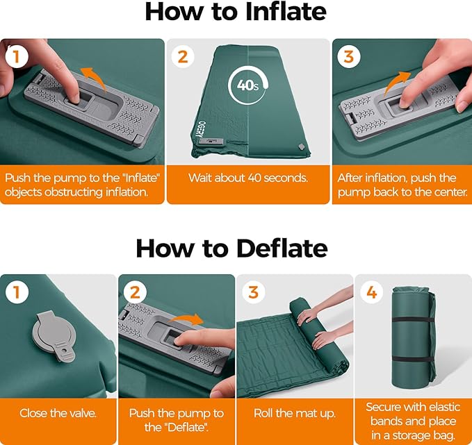 - ONE-TOUCH INFLATION AND DEFLATION ☛ Ditch the hassle of extra pumps or manual blowing! Our built-in intelligent air pump camping sleeping pad lets you inflate your pad automatically with a single click—just watch it expand. Setup is fast, so you spend less time prepping and more time enjoying the outdoors.