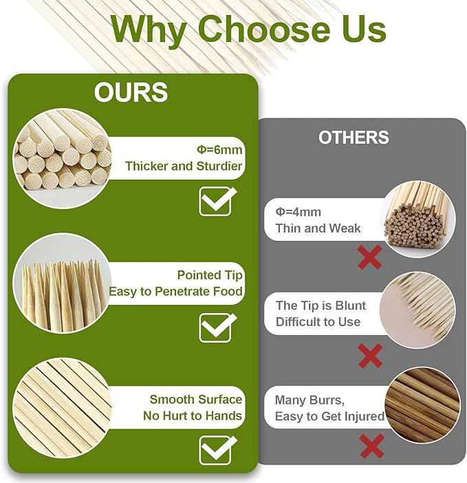 - User-Friendly Tips: For best results, soak the skewers in water for at least 10 minutes before use to enhance their durability and fire resistance. Adult supervision is advised when children are using them to ensure safety.