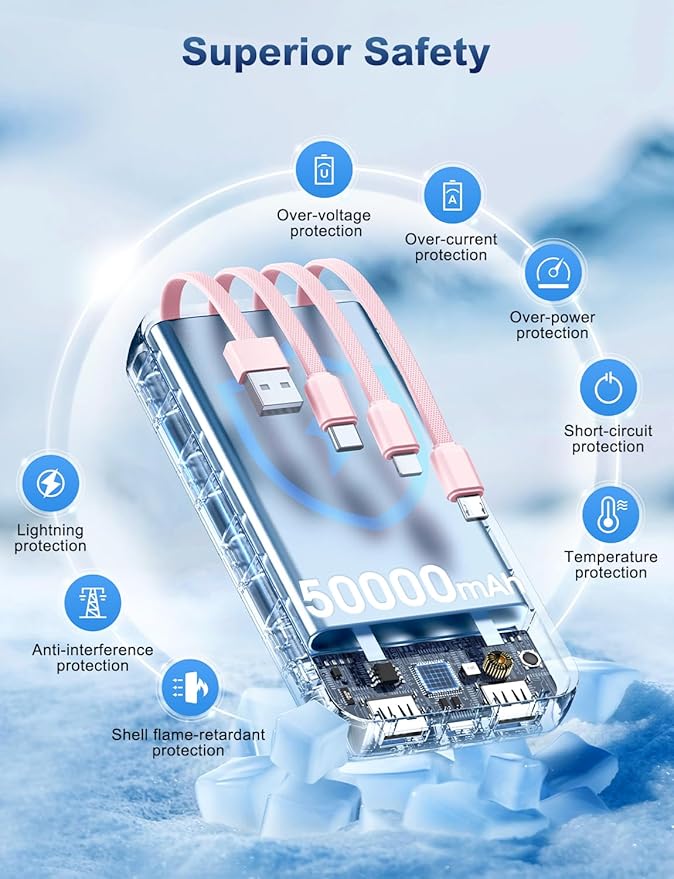 - Charge 6 Devices at Once: OHOVIV 50000mah Portable phone charger with 4 Built-in Cables(Lightning, Type-C, Micro, USB-A) and 3 Charging ports (2 USB-A , 1 Type-C), you can charge up to 6 devices at once without sacrificing power for Ultimate Convenience.These portable charger power bank cables made of high quality materials,withstanding over 10,000 bends.