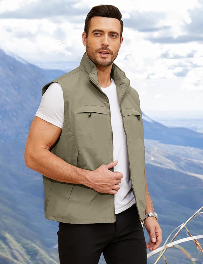 - Design: 2 bust invisible zippered pockets, 2 zippered side pockets, full zip tourist travel hiking vest, windproof and waterproof summer breathable cargo vest.