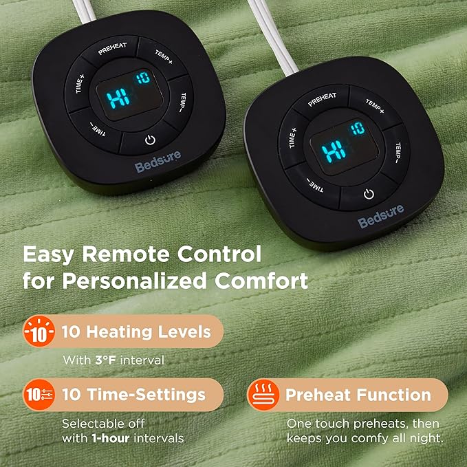 - Easy to Use: This king size electric blanket with dual control guarantees comfort for thermally incompatible couples. Preheat function conforms to changes in body temperature, keeping you comfortable all night without feeling dry