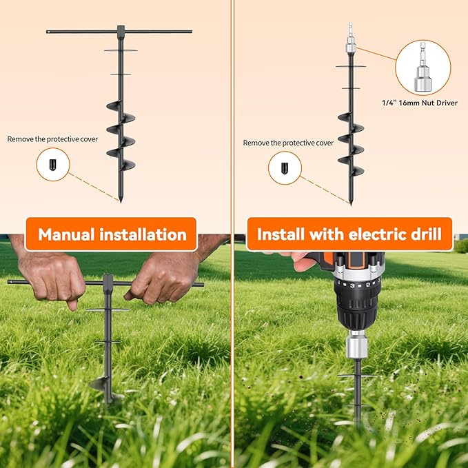- 【Easy to Install and Use】Two ways to install the dog yard leash and stake: Using a drill rig along with the included power nut drill bit makes installing the dog stake into the ground faster and easier. Also you can use bonus T-hook to hassle-free setup and removal of the dog tie out stakes, no need to search for iron rods