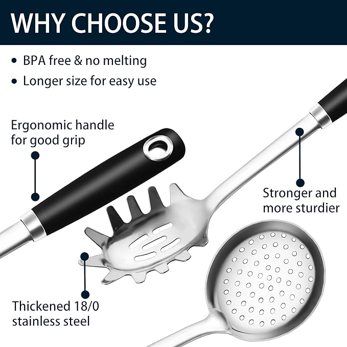 - HEAVY DUTY COOKING UTENSIL SET - This stainless steel cooking spoon set includes a pasta server and a slotted spoon/skimmer. They have thick and long handle and good heat insulation. That makes us feel comfortable to use them, and they won't bend easily.