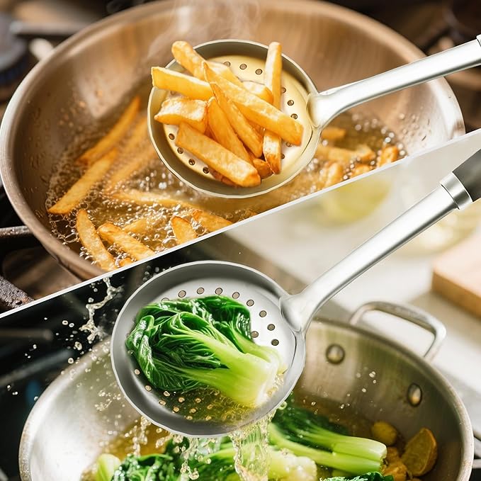 - VERSATILE KITCHEN UTENSILS - Suitable for serving spaghetti, frying, noodles, penne, boiled eggs, fusilli, ravioli, etc. The quick draining feature helps us to easily drain all kinds of food during frying and cooking.