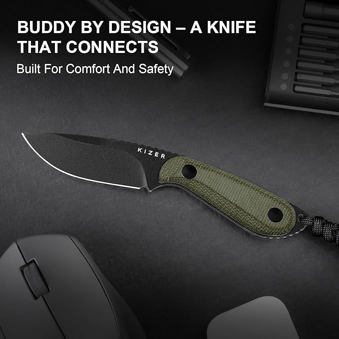 - Handy Stylish Fixed Blade Knife for Daily Tasks: The Kizer BUDDY fixed blade hunting knives features a 3" D2 steel blade, offering excellent edge retention and durability. With a hardness of HRC 58-62 and high carbon and chromium content, it resists wear and corrosion, making the edc fixed blade ideal for everyday tasks and outdoor activities. Whether for camping, hiking, or survival, this blade delivers consistent, long-lasting performance at an affordable price.