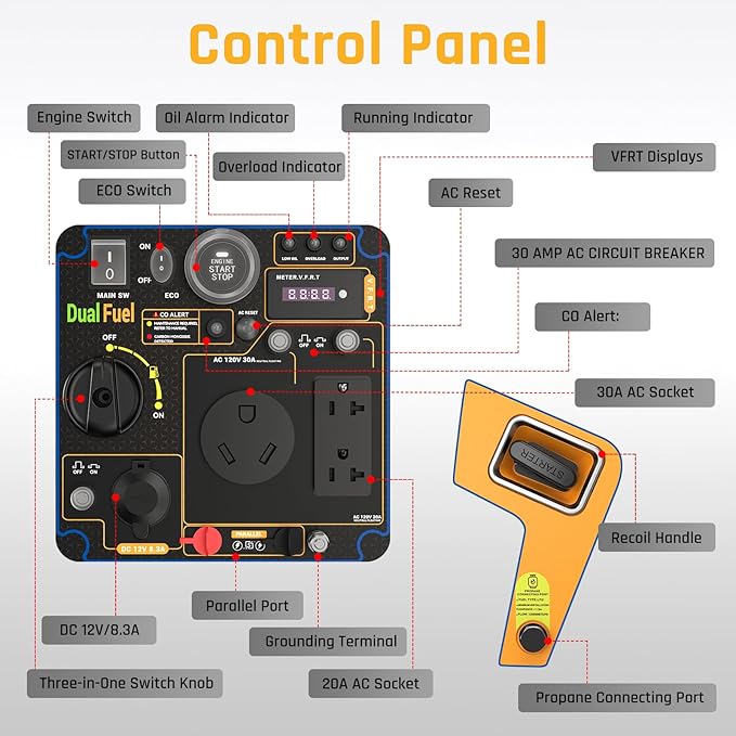 - Clean Power, CO Alert--Power sensitive gear safely: 120V 20A/30A + 12V DC + parallel ports. Inverter generator tech prevents surges. Built-in CO sensor kills the electric generator if risks rise. Overload alerts + breakers protect your tools whether tailgating or home use.