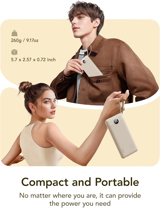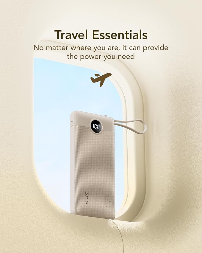 VRURC Portable Charger Power Bank,10000mAh Travel Essentials Battery Pack, 5 Outputs 2 Inputs Slim USB C Charging Bank Built-in Cables Cords Compatible with iPhone,Samsung,Android-Light Coffee(1 Pack)