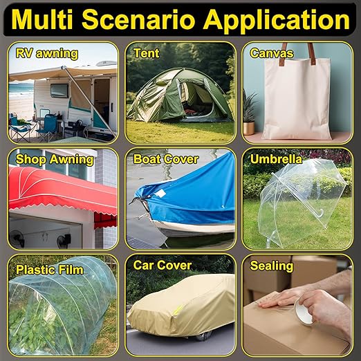 - Recommended Uses For Product : Repairing your canvas, tents, pop-up camping, camping canopies, leather, boat covers, tarps, sails, umbrellas, sunshade, plastic film, etc. Repairing your canvas, tents, pop-up camping, camping canopies, leather, boat covers, tarps, sails, umbrellas, sunshade, plastic film, etc.