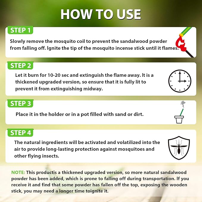 - HOW TO USE: Ignite the tip of the mosquito incense stick until it flames. Let it burn for 10-30 sec and extinguish the flame away. Then place it in the ground or in a pot filled with sand or dirt. Try to keep the mosquito repellent in the ground or in a pot that is as close to the floor as possible. For optimal mosquito protection results, place 4-5 pieces of incense sticks to create a perimeter around your patio or any other outdoor areas.