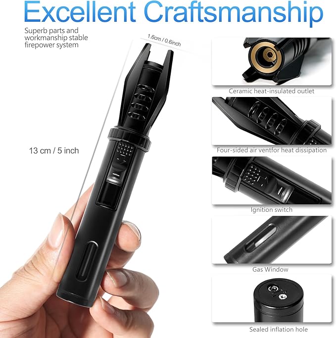 - This mini torch lighter uses heat-resistant ceramics at the nozzle, the body is made of zinc alloy metal material,With Visible Fuel Level Window, Which Will Remind you When your Lighter Needs to Refill and Check the Status of Butane Refilling