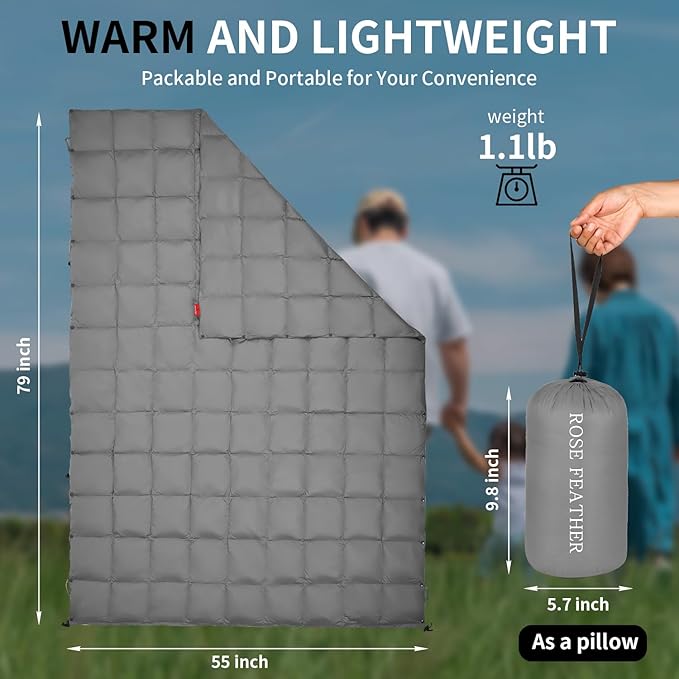 - 【Outdoor Down Camping Blanket】ROSE FEATHER down camping blanket can keep you warm and cozy no matter where you are. It can also be used as a sleeping bag alternative or supplement, or wearable blanket to accompany you on camping, backpacking, hiking, beach or festivals, or to rest on the sofa in the afternoo