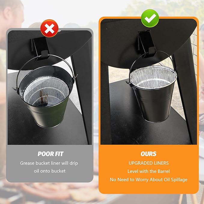 - 【Grease Liners】- The package includes 10 aluminum liners, aluminum will not deform and crack under high-temperature smoker grease to prevent grease from touching your barrel. Unlike the liners sold on the market that don't match the height of the oil catcher bucket, our liners are taller and can cover all the space inside the oil catcher bucket.