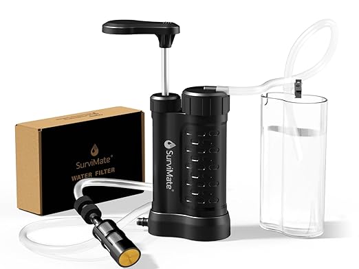 - 💧5-STAGE WATER FILTER PUMP: 1. High-performance medical-grade hollow fibre ultrafiltration membrane, 2. Pre-medical-grade PP cotton, 3. High-quality activated carbon fibre, 4. Post-medical-grade PP cotton, 5. Metal pre-filtration,The SurviMate is portable and the perfect solution to water shortages in emergencies, and instantly transforms a nearby water source into healthy drinking water. A must have for travelling, backpacking, camping and emergency kits!