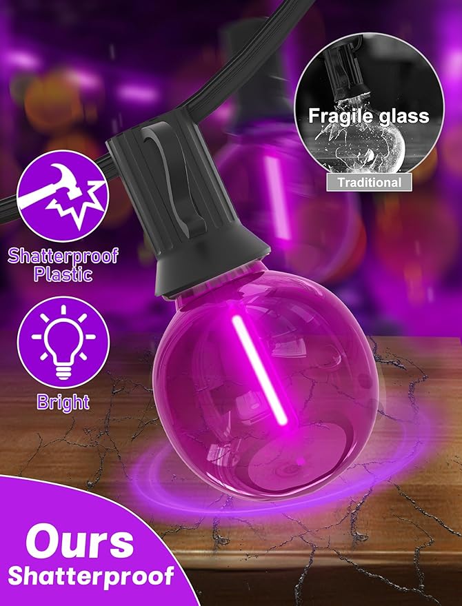 - Practical and easy to install: G40 purple string lights can be easily installed using cable ties or cup hooks, you can fix it or place it anywhere as needed. The safe and reliable orange led lights are equipped with an E12 socket base and a built-in spare fuse for easy replacement