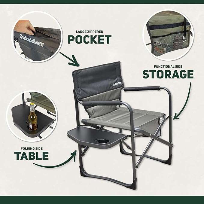 OUTSIDER Portable Directors Camping Chair, Lightweight Folding Aluminum Outdoor Chair with Side Table and Storage Pouch for Camping, Lawn, Sports and Fishing, Heavy Duty Supports 350lbs