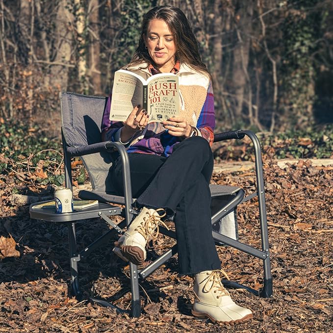 - Outdoor Convenience: Designed with functionality in mind, this foldable director’s chair includes sturdy armrests for reliable support, a side table with an integrated cup holder, and multiple storage slots and pockets to keep essentials close at hand.
