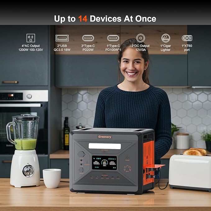 - [Can charge and supply 14 devices at the same time] 4 AC ports, 2 USB-A (QC3.0) ports, 3 USB-C (PD 20W) ports, 1 USB-C (PD 100W) port, 1 cigarette lighter port, 2 DC5521 ports, and one XT60 port. Power station with 14 ports, you can power more home appliances, so you can live a normal life. Compatible devices include smartphones, laptops, power tools, cooking appliances, in-vehicle products, and RC airplanes. Solar power generator for home are useful in various situations such as disaster preparedness, power outages, sleeping in the car, camping, and leisure.