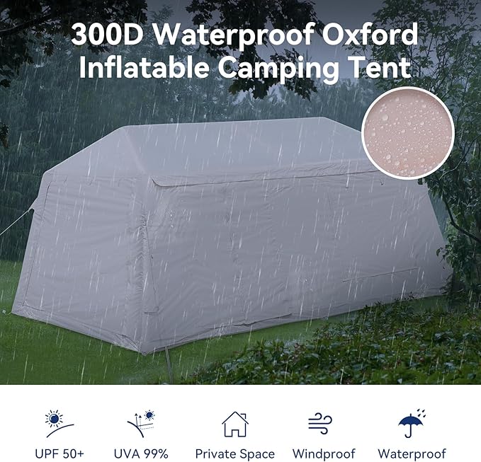 - PU3000mm Waterproof Inflatable Tent for Camping: Crafted from 300D Oxford fabric with UPF50+ coating, this tent delivers sun protection and tear resistance. Heavy-duty PVC air beams and reinforced guylines provide reliable stability in strong winds. Use a ground tarp(not included) underneath during heavy rain for added protection.