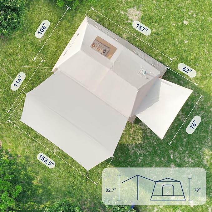 - 3 in 1 Versatile Inflatable Tent with Awning: Fully enclosed tent mode provides total weather protection for secure camping. Easily convert to Tent+Awning mode to gain extra covered space perfect for outdoor dining. For ultimate flexibility, the standalone 149.6"L×114.2"W awning creates a spacious shaded area ideal for group gatherings and activities.