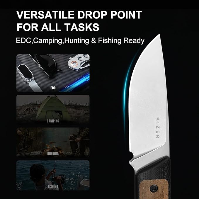 - Drop Point Blade for Every Task: The drop point blade is designed to handle both precise tasks and heavy-duty use with ease. Whether it’s opening packages or field dressing game, this classic bushcraft knife shape is ideal for a wide range of applications, making it a dependable kizer knife with sheath for urban adventures and outdoor challenges alike.