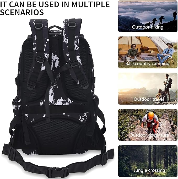 - 【Expanding space】 The camping durable backpack has multiple webbing and mounting systems, which can be bundled with outdoor equipment such as camera racks and moisture-proof mats, and can also be added with water bottles and accessory bags to effectively increase the space.