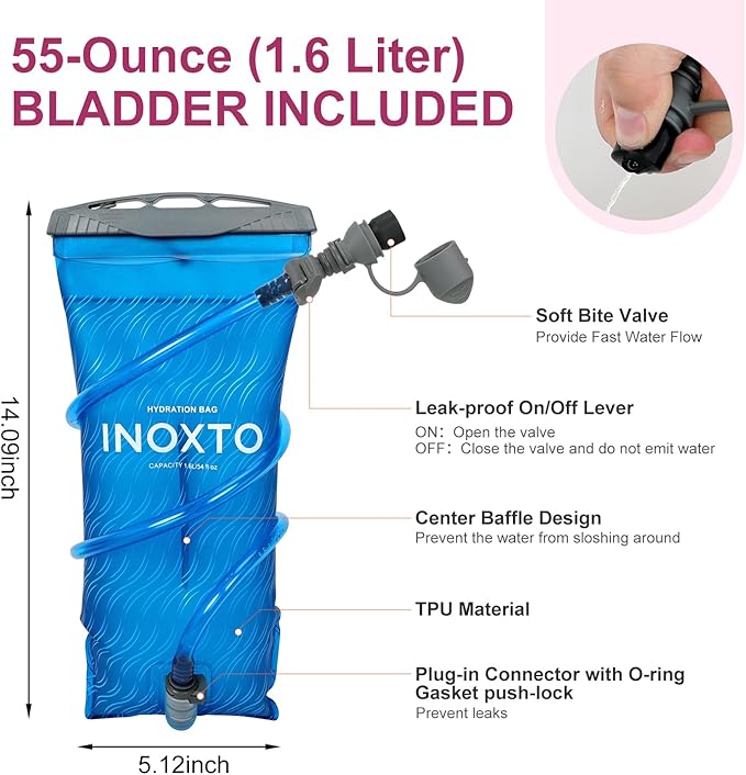 • 【Extensive Applications】Our hydration pack with water bladder is the perfect sports gear you hydrated while running, marathon, cycling, hiking, skiing, climbing, race and training or any adventure outdoors. This running hydration vest can be a are great companions for families and friends. IX INOXTO hydration backpack is always be there for you. If you have any problems, please reach out to us, we will reply within 24hrs.