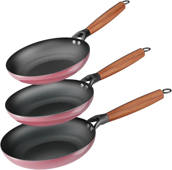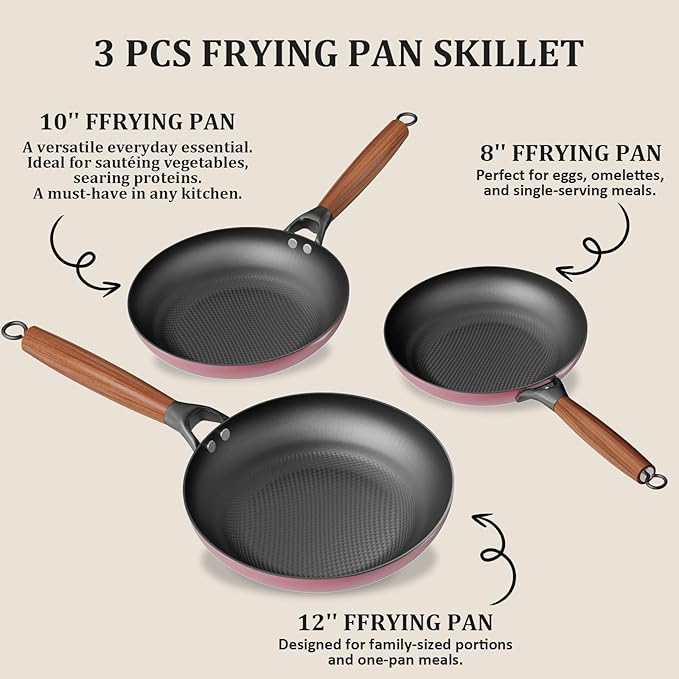 - NON-STICK FRYING PAN SET FOR EVERYDAY COOKING: The skillet comes in three sizes (8'', 10'' and 12''). The 8 inch enameled cast iron frying pan is a solid choice for cooking eggs and omelettes, 10 inch frying pan is a must-have for any home cook, and the 12 inch size offers ample cooking space for family meals or meal prepping.