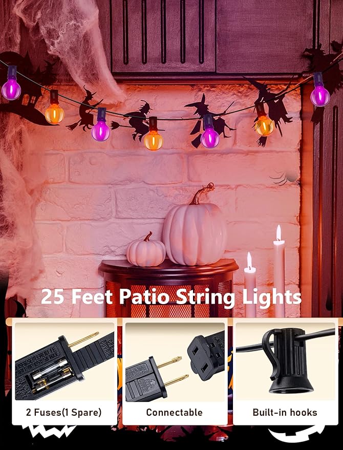 - 25Ft Led Outdoor Halloween lights with 27 G40 orange purple LED shatterproof globe bulbs (2 spare bulbs), C7 or E12 Candelabra base led bulbs, 0.6W/120V, halloween outdoor patio lights providing bright illumination while saving on electricity costs.