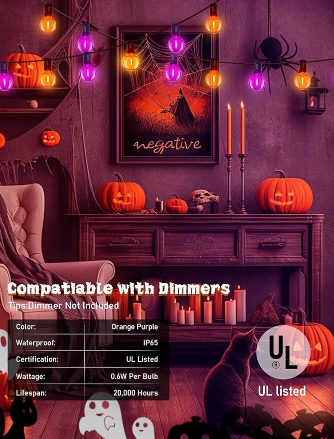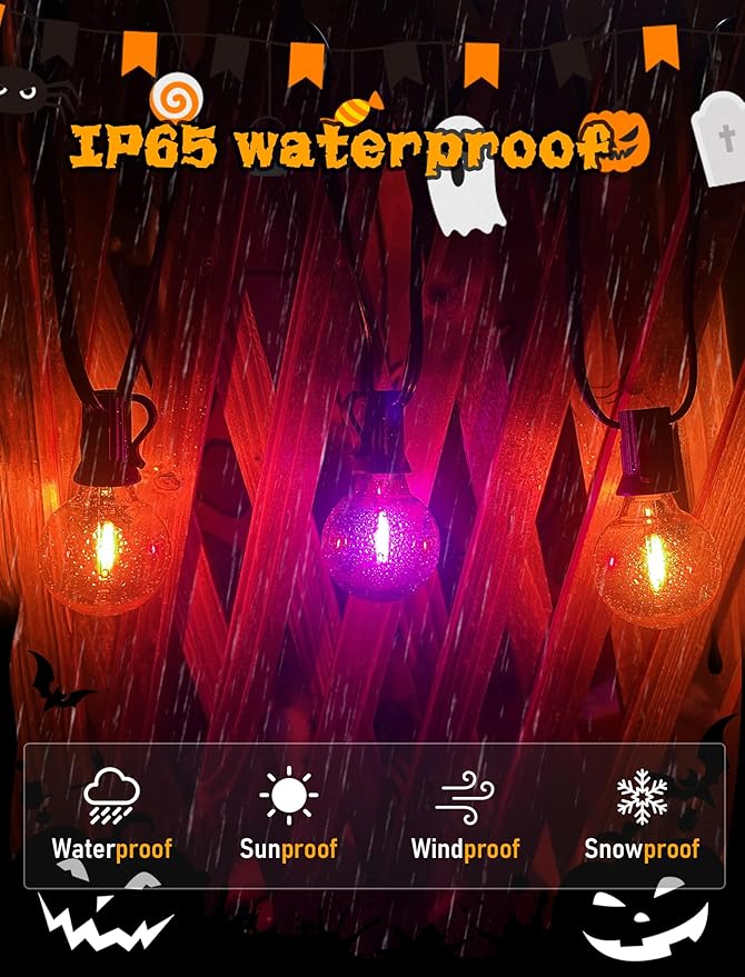 - UL Certified: G40 led globe string light bulbs are made with high-quality materials, these lights are designed to withstand outdoor conditions, making them perfect for both indoor and outdoor use. commercial grade led string lights outdoor ensuring safety and longevity even in outdoor environments. Halloween lights outdoor waterproof can withstand extreme temperatures, rain, wind, and damp climates. outdoor string lights come with a mix of orange, purple LED bulbs,Ideal for decorating your porch, patio, garden, or any indoor space to enhance the Halloween spirit.