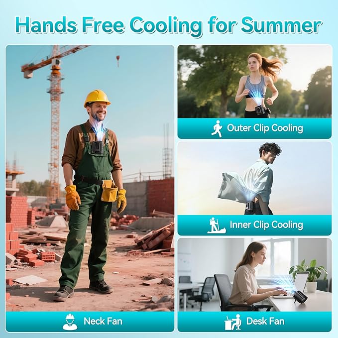 - 【Hands-Free 4-in-1 Portable Fan】Our 4-in-1 Multifunctional Body Fan combines a Waist Fan, Neck fan (with lanyard), Desk Fan, and Handheld Fan, suitable for various summer occasions. The Upgraded dual-sided clip design securely attaches the Shirt Fan to your belt or clothing. The Wearable Fan is designed for high-temperature environments, freeing your hands and helping you easily withstand the heat.