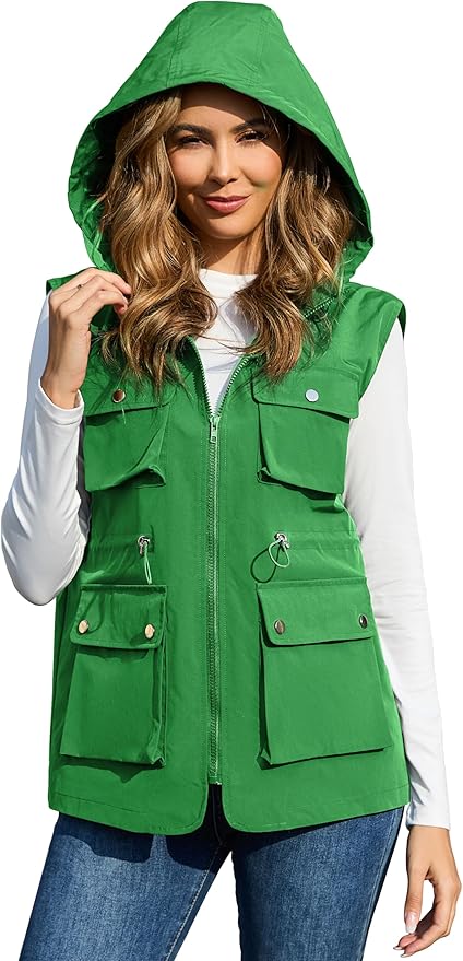 PESION Womens Packable Military Utility Vests Outerwear Waterproof Windbreaker Jacket Cargo Vest with Removable Hood