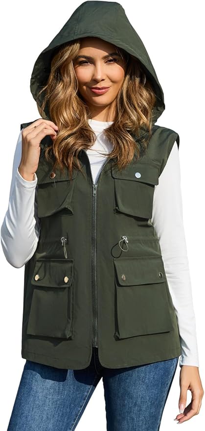PESION Womens Packable Military Utility Vests Outerwear Waterproof Windbreaker Jacket Cargo Vest with Removable Hood