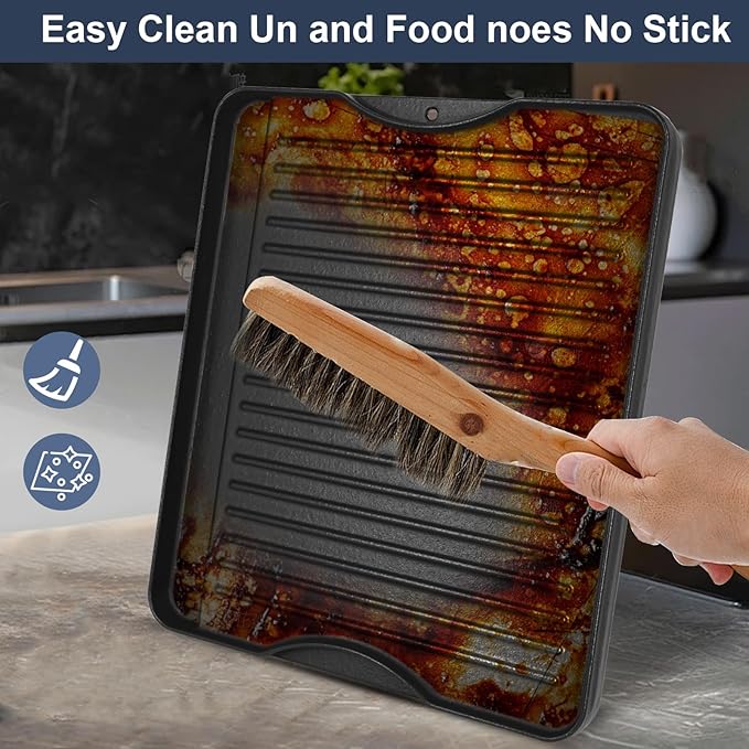 - 【Practical Choice】➤Double-Sided Pan: The smooth side is designed for cooking eggs, pancakes, and bacon, while the ridged side is ideal for grilling steaks, burgers, fish, chicken, and vegetables. ➤Dual Handle Design -Pre-Seasoned Cast Iron Reversible Grill have two easy-to-grip handles, enabling effortless lifting, flipping, and space-saving vertical storage when not in use.