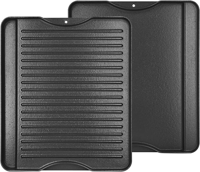 - 【Upgrade Material】➤The griddle replacement made of premium matte enamel cast iron that stronger and more sturdy than others, not easy to deform, rust and corrosion resistance, and high temperature resistance. NOTE: Before using for the first time, the griddle for gas grill should be seasoned so that the surface does not stick.Spend less time scrubbing and more time tasting your cooking creations.