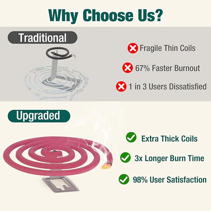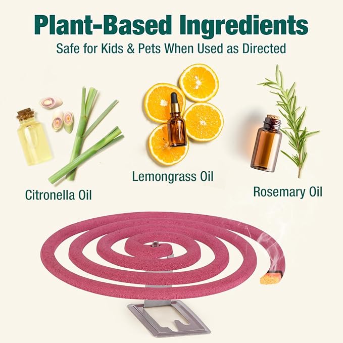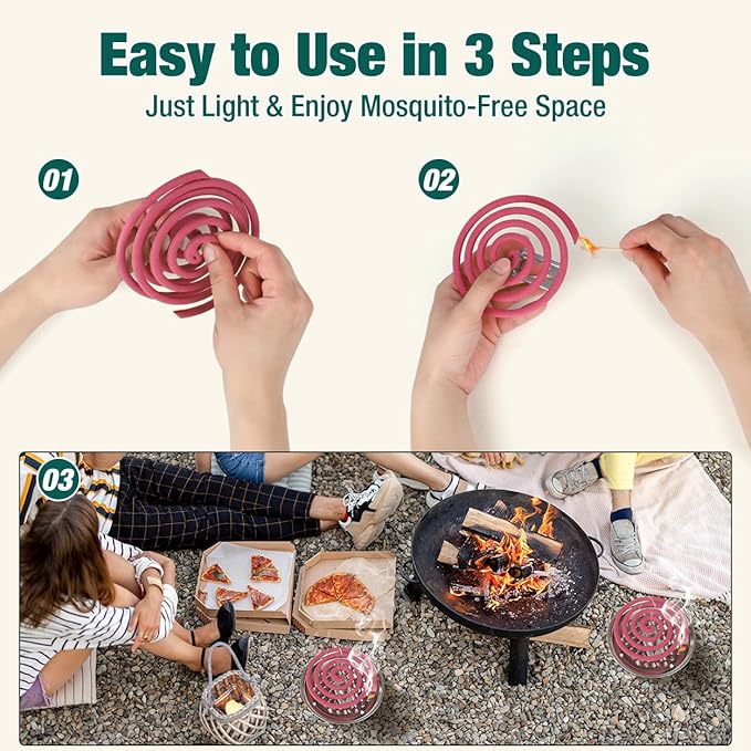 - Long-Lasting Protection: Each coil provides up to 6 hours of protection, offering extended relief from mosquitoes, flies, and spiders. Perfect for backyard BBQs, camping, or relaxing on the patio, these coils help create a mosquito-free space for hours. 4 Stands and 1 Holder are INCLUDED