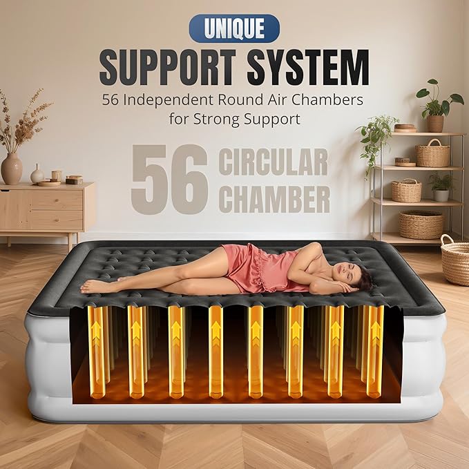 - Innovative Independent Support System: Our inflatable mattress features a unique independent support system composed of multiple air chambers. Each chamber operates independently, adapting to your body shape and movements to provide targeted support precisely where you need it most. This design not only enhances overall comfort but also helps reduce pressure points, ensuring a peaceful sleep for people of all body types.