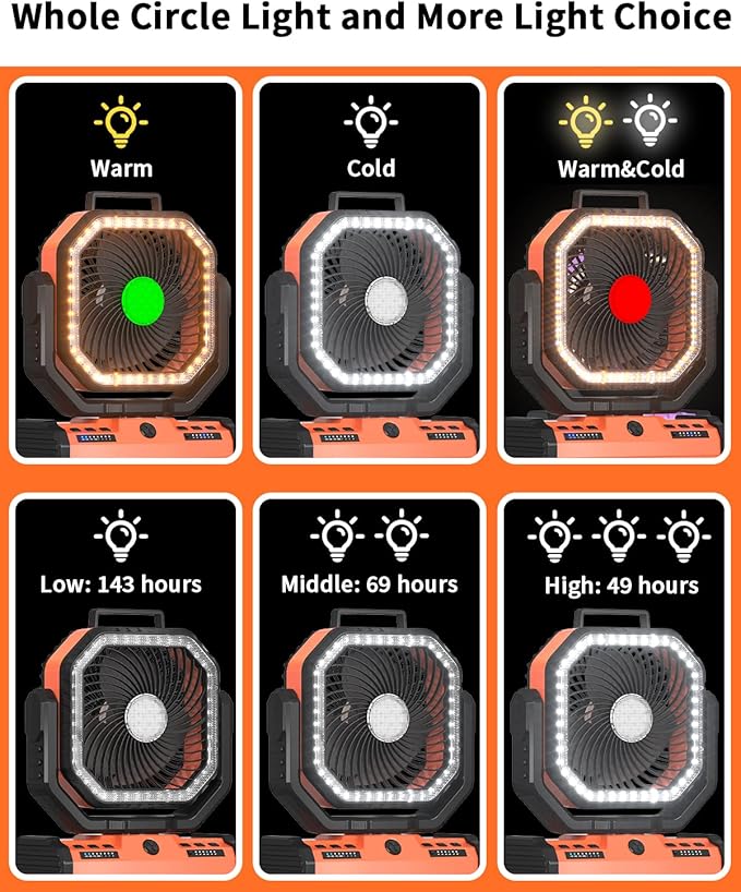 - 3 Level of Light Brightness & 3 Color Temperature - This camping tent fan with LED latern can illuminate your enviroment when it's dark. 3 color temperature, warm/cold/warm&cold, provide more options to meet your preference. Choose from low brightness to high brightness, a fully charged battery fan can be used for 143-69-49 hours.