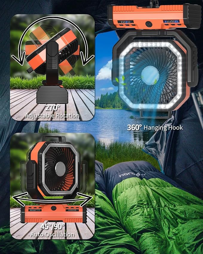 ADUST 12 Inch Camping Battery Operated Powered Fan with LED Lantern Light,44000mAh Rechargeable Portable Oscillating Fan with 360° Rotation Hanging Hook for Tents, Cordless USB Desk Fan(Orange)