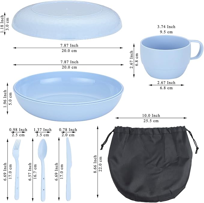 - 1. All-in-One Compact Outdoor Solution:The Evanda Reusable Camping Mess Kit includes a drinking cup, plate, bowl, fork, spoon, knife, and a carry bag—everything you need for meals on the go. The bowl and plate nest securely together, while the cup and utensils neatly fit inside, minimizing space in your backpack.