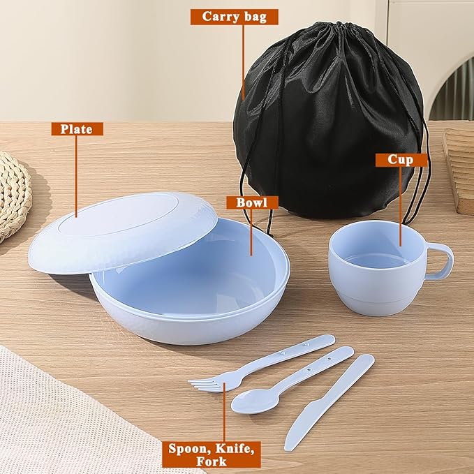 Evanda Camping Mess Kit with Bowl, Plate, Cup, Spoon, Fork, Knife and Carry Bag, Reusable Camping Accessories Essentials Gear Light Weight and Small Space Easy to Carry or Put in Backpack