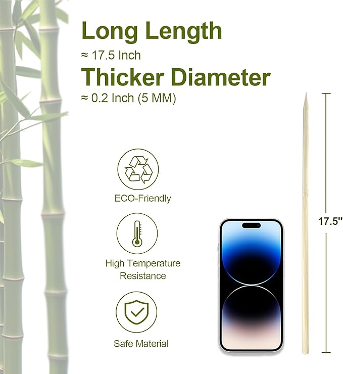 - Eco-Friendly and Disposable Wooden Skewers: Made from 100% natural bamboo, our biodegradable skewer sticks are designed for one to two uses. After enjoying your barbecue or S’mores sticks for fire pit gatherings, simply toss them into the fire pit for easy cleanup—no sticky residue left behind!