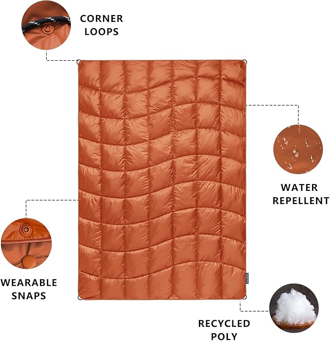 - Durable and Water-Resistant Blanket:The outer shell of this outdoor blanket is made of 20D rip-resistant nylon,With an upgraded coating with water repellency, dust and sand resistance, and pet hair.Stains are easy to wipe off, just wipe with a damp towel.It also locks in mildness against the cold, keeping you warm even in the cold wilderness.