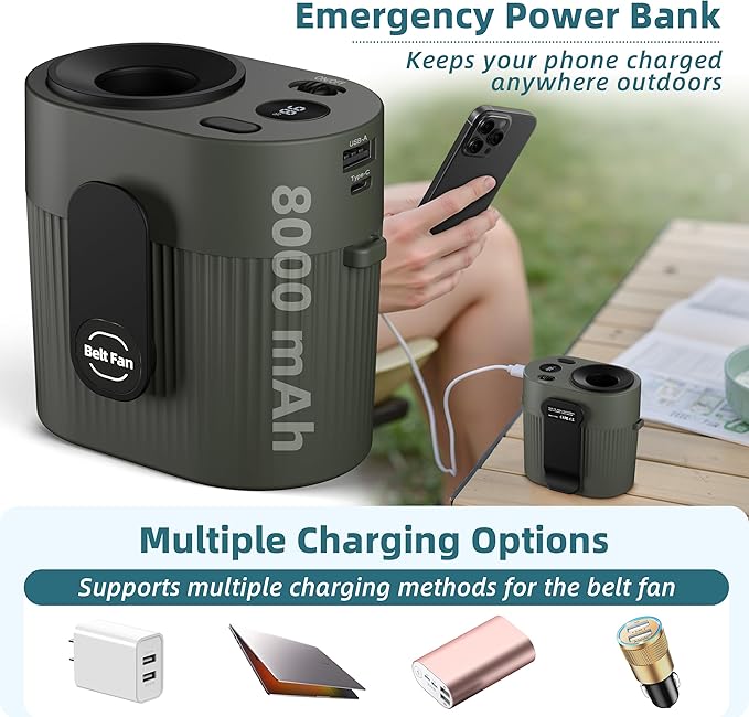 - 14h Working Time & Emergency Power: The rechargeable 8000mAh high-capacity belt clip fan provides 4–14 hours of continuous cooling (varies by speed) and doubles as an emergency power bank, charging your phone via the USB-A output port (5V/2A)