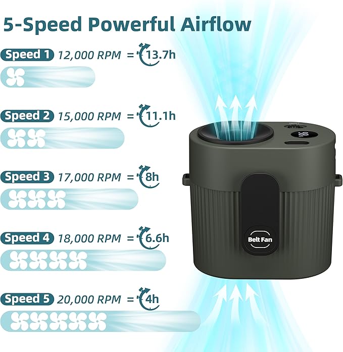 - Turbo-Cool Technology: Features a 5-speed adjustable (12,000-20,000 RPM) waist fan with a high-performance brushless motor. The max speed of our waist fan generates 3X stronger airflow than conventional fans, delivering instant heat relief for outdoor activities